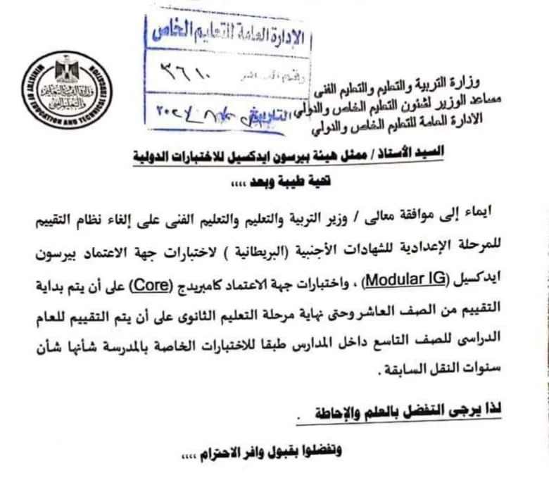 أصدرت إدارة التعليم الخاص والدولى بـ وزارة التربية والتعليم والتعليم الفني، خطابا لممثل هيئة بيرسون ايدكسيل للاختبارات الدولية بشأن موافقة محمد عبداللطيف وزير التربية والتعليم والتعليم الفنى على إلغاء نظام التقييم للمرحلة الإعدادية للشهادات الأجنبية البريطانية لاختبارات جهة الاعتماد بيرسون اید کسیل (Modular IG) ، واختبارات جهة الاعتماد كامبريدج (Core) .