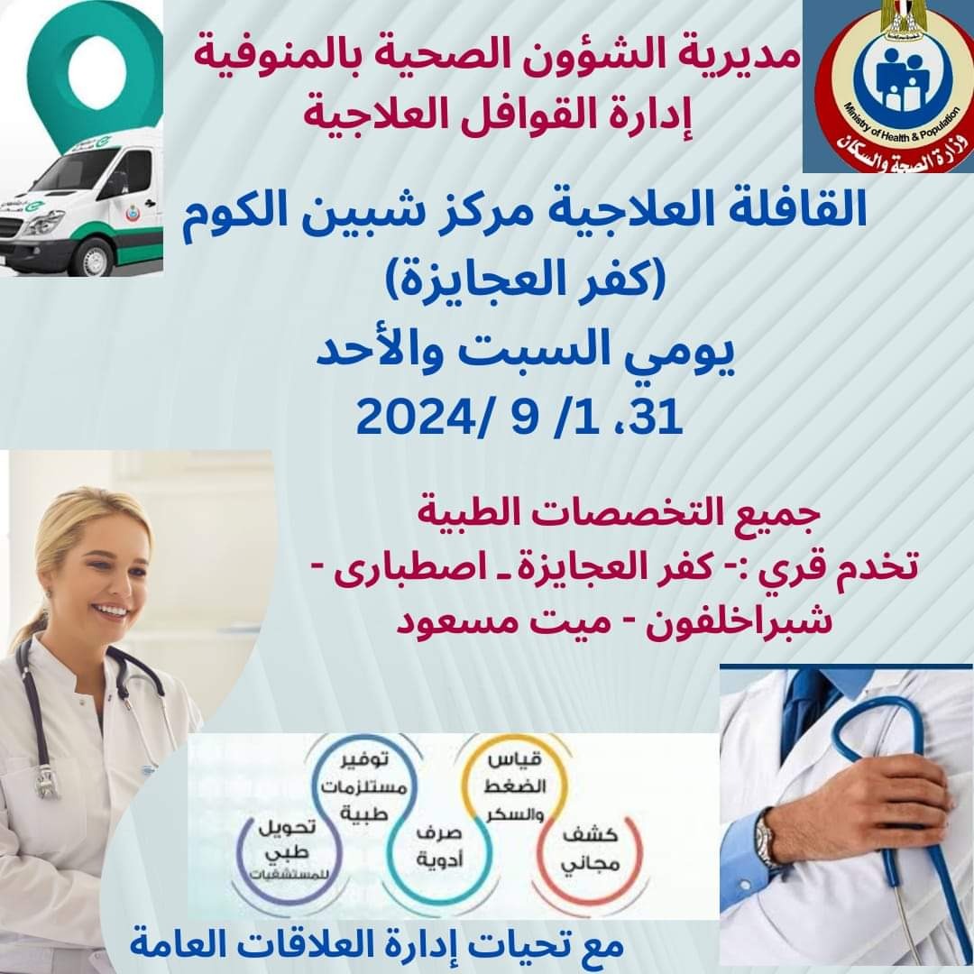 حيث أشار الدكتور محمد فوزي وكيل وزارة الصحة ، عن تنظيم قافلة علاجية مجانية بقرية كفر العجايزة بمركز ومدينة شبين الكوم وذلك على مدار اليوم السبت ٣١ اغسطس، والأحد 1 سبتمبر وتخدم قرى ، ( كفر العجايزة ، اصطباري ، شبرا خلفون ، ميت مسعود ) بهدف الارتقاء بمستوى الخدمات المقدمة والمساهمة في تخفيف العبء عن أهالينا بالقرى والنجوع كون الإنسان المصري أحد أهم محاور الجمهورية الجديدة ، حيث تضم القافلة تخصصات ( الباطنة - الأطفال - الجراحة - الأسنان - الجلدية - نساء وتوليد - تنظيم أسرة - أنف وأذن وحنجرة ) ويتم الفحص والكشف على المواطنين من خلال فريق طبى متخصص لتقديم خدمة طبية متميزة للأهالي، بالإضافة إلى إجراء التحاليل اللازمة والأشعة وتقديم العلاج بالمجان مع عمل ندوات توعوية وتثقيفية للمواطنين.