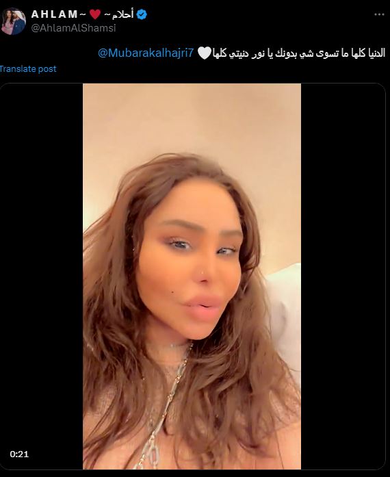 ونشرت أحلام ،فيديو عبر حسابها على موقع التدوينات "إكس" وهما في حالة من، الرومانسية،وعلقت: «الدنيا كلها ما تسوى شي بدونك يا نور دنيتي كلها».