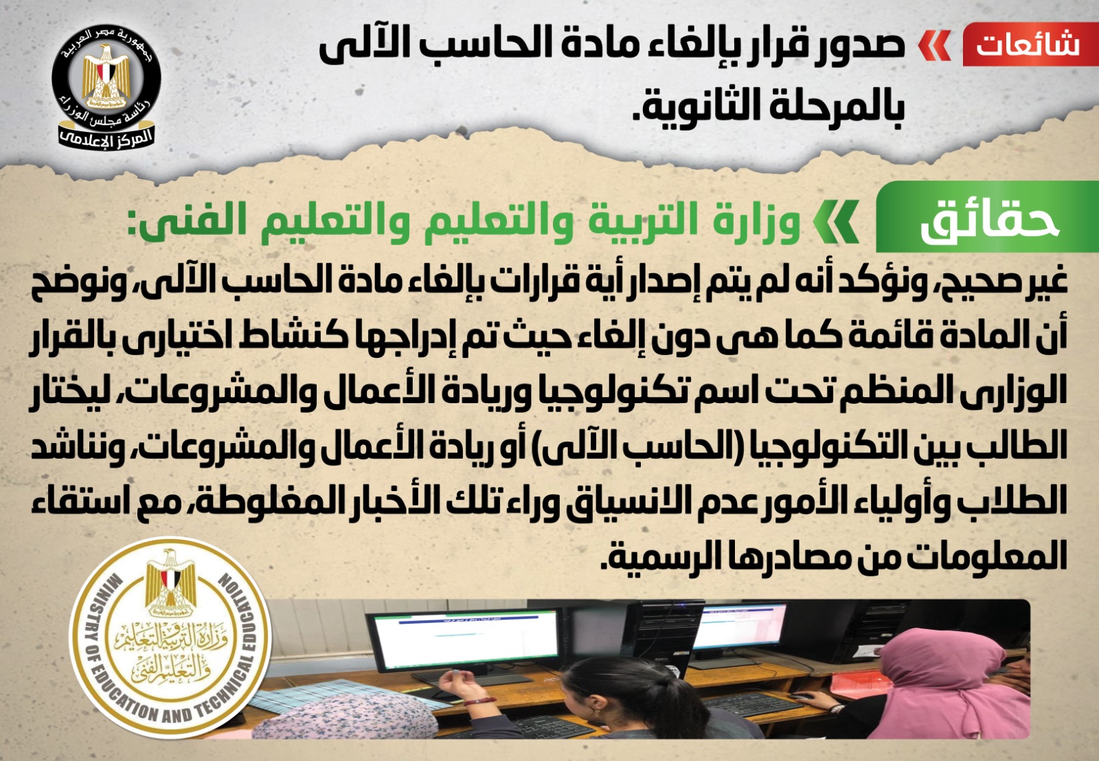 وتداولت بعض صفحات التواصل الاجتماعي أنباء بشأن صدور قرار بإلغاء مادة الحاسب الآلي بالمرحلة الثانوية، وقد قام المركز الإعلامي لمجلس الوزراء بالتواصل مع وزارة التربية والتعليم والتعليم الفني، والتي نفت تلك الأنباء، مُؤكدةً أنه لا صحة لإلغاء مادة الحاسب الآلي بالمرحلة الثانوية، وأنه لم يتم إصدار أية قرارات بإلغاء مادة الحاسب الآلي، موضحة أن المادة قائمة كما هي دون إلغاء حيث تم إدراجها كنشاط اختياري بالقرار الوزاري المنظم تحت اسم تكنولوجيا وريادة الأعمال والمشروعات، ليختار الطالب بين التكنولوجيا (الحاسب الآلي) أو ريادة الأعمال والمشروعات، مُناشدةً الطلاب وأولياء الأمور عدم الانسياق وراء تلك الأخبار المغلوطة، مع استقاء المعلومات من مصادرها الرسمية.