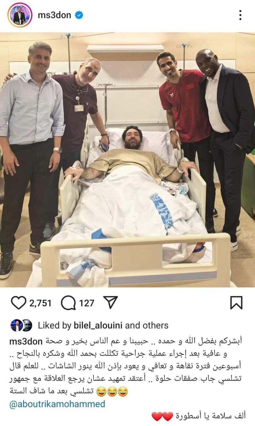 وكتب على الصورة: "أبشركم بفضل الله وحمده.. حبيبنا وعم الناس بخير وصحة وعافية بعد إجراء عملية جراحية تكللت بحمد الله وشكره بالنجاح. أسبوعين فترة نقاهة وتعافي، ويعود بإذن الله ينور الشاشات".