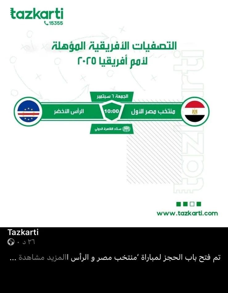 قامت شركة تذكرتي، بالإعلان عن فتح باب حجز تذاكر مباراة منتخب مصر ضد كاب فيردي في تصفيات أمم إفريقيا، ويلعب منتخب مصر ضد كاب فيردي يوم 6 سبتمبر الجاري في استاد القاهرة، في الجولة الأولى من تصفيات أمم إفريقيا 2025 في المغرب، وتنطلق المباراة في تمام العاشرة مساء.