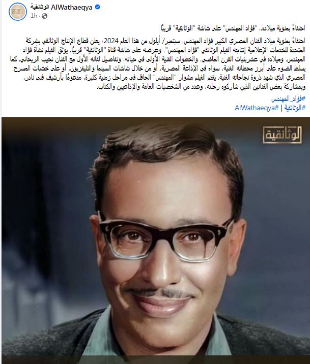 ونشرت الصفحة الرسمية لـ قناة الوثائقية عبر موقع التواصل الاجتماعي «فيسبوك»، صورة الراحل فؤاد المهندس، وكتبت: «احتفاءً بمئوية ميلاد الفنان المصري الكبير فؤاد المهندس، سبتمبر من هذا العام 2024، يعلن قطاع الإنتاج الوثائقي بالشركة المتحدة للخدمات الإعلامية إنتاجه الفيلم الوثائقي فؤاد المهندس، وعرضه على شاشة قناة الوثائقية قريبًا».