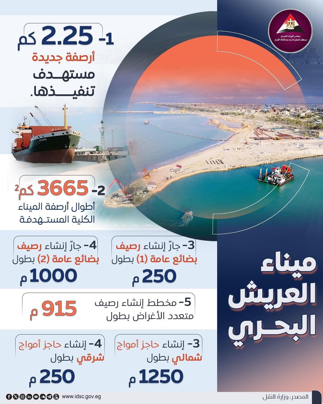 ومن المستهدف وفقا لما عرضه مركز معلومات مجلس الوزراء ، تنفيذ 2.25 كم أرصفة جديدة بميناء العريش البحرى، وإنشاء حاجز أمواج شمالى بطول 1250 متر.
