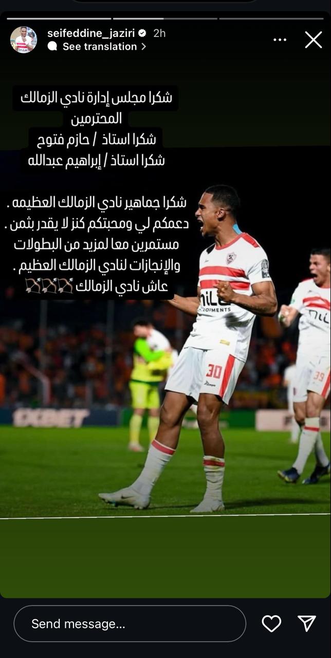 ونشر الجزيري عبر صفحته الشخصية عبر تصبيق "انستجرام":“شكرًا مجلس إدارة نادي الزمالك المحترمين، شكرًا استاذ حازم فتوح، شكرًا استاذ إبراهيم عبدالله، شكرًا جماهير نادي الزمالك العظيمة، دعمكم لي ومحبتكم كنز لا تقدر بثمن”.