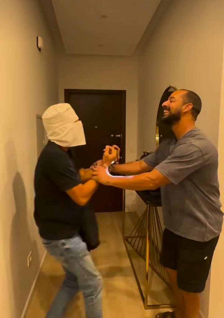 نشر النجم عمرو وهبه فيديو طريف له وهو يمسك شخص يقتحم منزله مرتدي قناع مثل المطرب الشاب تووليت بغرض السرقة .