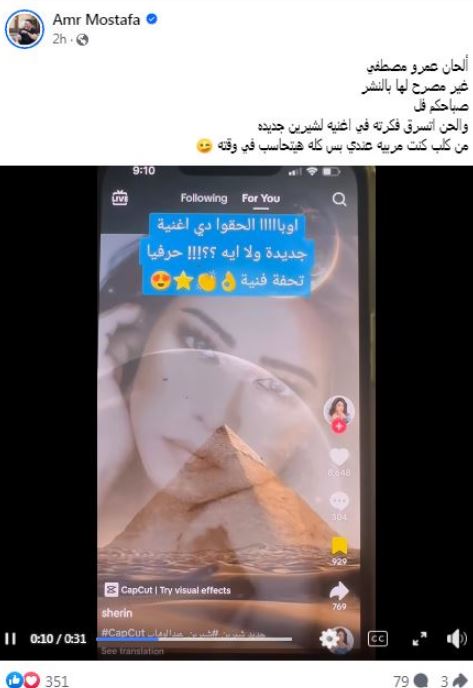 ونشر عمرو مصطفى مقطعا من أغنية لـ شيرين عبد الوهاب، عبر حسابه الرسمي بموقع التواصل الاجتماعي "فيسبوك" وعلق عليه: "ألحان عمرو مصطفى غير مصرح لها بالنشر واللحن اتسرق فكرته في أغنية لـ شيرين جديدة.. كله هيتحاسب في وقته".