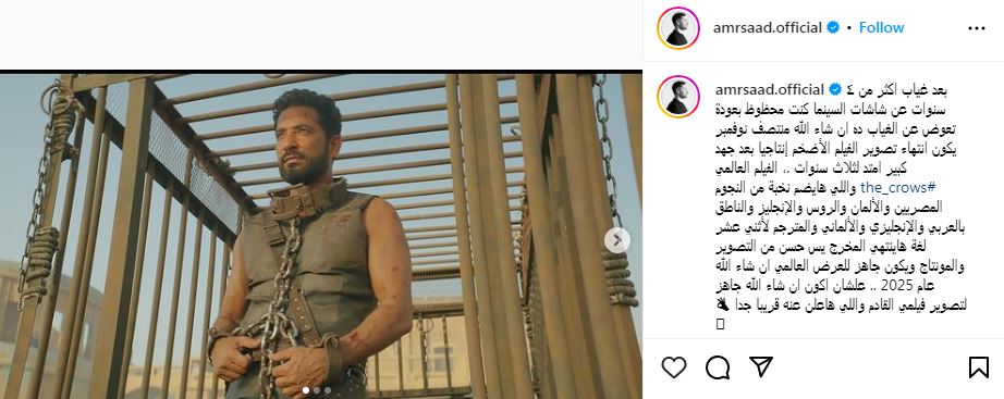 وفي وقت سابق، شارك عمرو سعد عبر حسابه على موقع التواصل الاجتماعي «إنستجرام»، مجموعة صور من كواليس العمل، وعلق: «بعد غياب أكثر من 4 سنوات عن شاشات السينما كنت محظوظ بعودة تعوض عن الغياب ده ان شاء الله منتصف نوفمبر يكون انتهاء تصوير الفيلم الأضخم إنتاجيا بعد جهد كبير امتد لثلاث سنوات، الفيلم العالمي the crows».