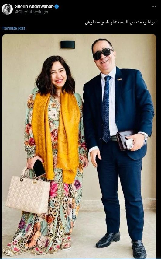 ونشرت شيرين عبد الوهاب، صورة تجمعها مع المستشار ياسر قنطوش، عبر حسابه الشخصي بموقع التغريدات القصيرة تويتر، وقالت: أبويا وصديقي المستشار ياسر قنطوش.