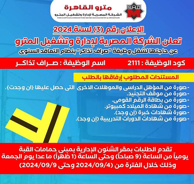 وكشفت الشركة المصرية لإدارة وتشغيل المترو، عن حاجتها لشغل وظائف مترو الأنفاق، وتحديدًا وظيفة "صراف تذاكر" بنظام التعاقد السنوي.