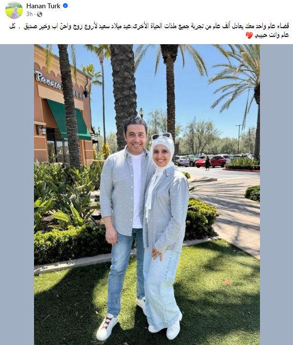 احتفلت الفنانة حنان ترك بعيد ميلاد زوجها عبر صفحاتها الرسمية على مواقع التواصل الاجتماعي ،ونشرت حنان صورة لهما وعلقت عليها " قضاء عام واحد معك يعادل ألف عام من تجربة جميع ملذات الحياة الأخرى،عيد ميلاد سعيد لأروع زوج واحنّ أب وخير صديق , كل عام وانت حبيبي ."