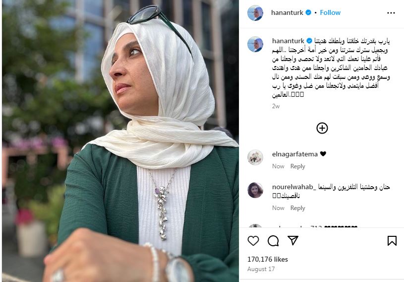 ونشرت حنان ترك صورتها عبر حسابها على «إنستجرام» وعلقت: «يا رب بقدرتك خلقتنا وبلطفك هديتنا و بجميل سترك سترتنا ومن خير أمـة أخرجتنا.. اللهـم فأتم علينا نعمك التي لا تعد ولا تحصى واجعلنا من عبادك الحامدين الشاكرين».