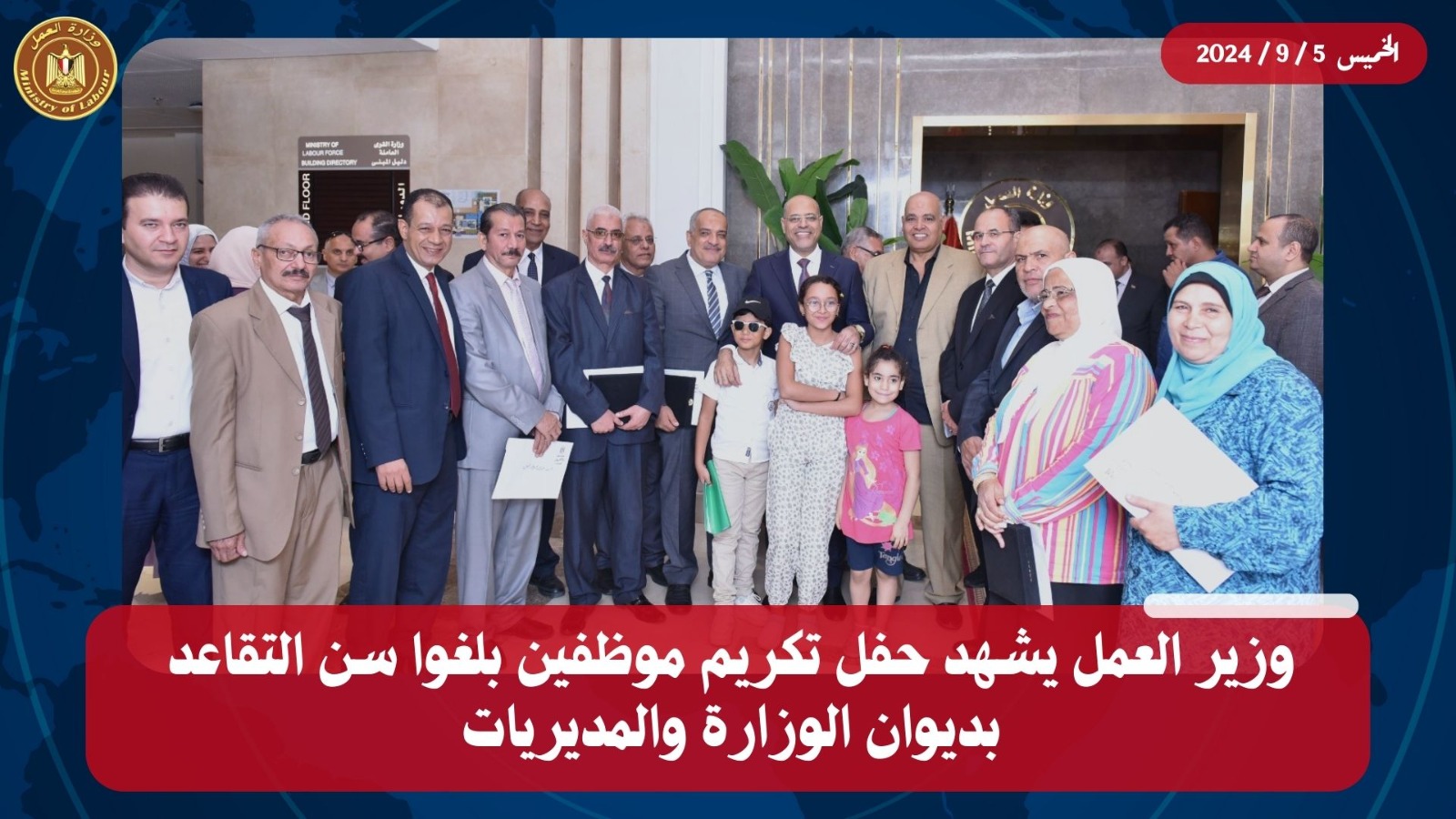 شهد وزير العمل محمد جبران ، اليوم الخميس ، فعاليات حفل تكريم 27 من العاملين بالوزارة والمديريات ممن بلغوا سن التقاعد ، من الديوان العام والمديريات ، تقديراً لجهودهم خلال فترة عملهم داخل الوزارة والمديريات وما قدموه لخدمة المواطنين والمجتمع خلال فترة خدمتهم ، وذلك بمقر الوزارة بالعاصمة الإدارية الجديدة.