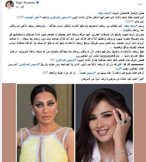 ونشرت فجر السعيد، صورة تجمع بين "ياسمين" و"بسمة وهبة"، عبر حسابها الرسمي على "فيس بوك"، وقالت معلقة على الصورة: "ممكن توصلوا هذا المنشور للسيدة بسمة وهبة، اللي فتحت حلقة كاملة بالقناة التي تعمل فيها لتناقش طلاق الفنانة الكبيرة ياسمين عبد العزيز والنجم أحمد العوضي".