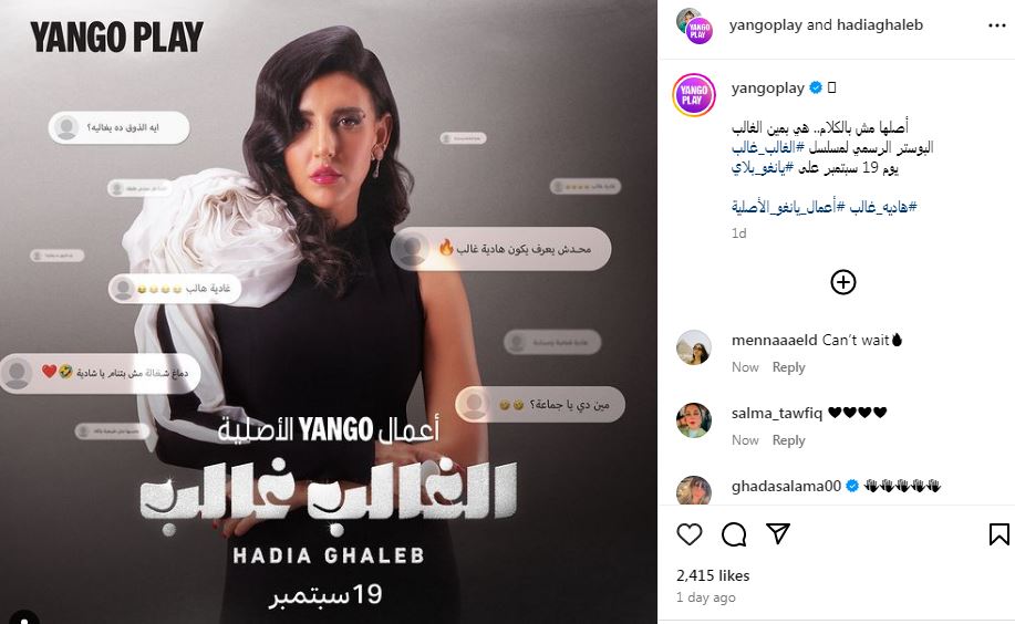 تستعد المصممة والبلوجر هادية غالب، لطرح مسلسلها الواقعي الجديد "الغالب غالب"، الذي تقوم ببطولته ومن المقرر أن يبدأ عرضه يوم 19 سبتمبر 2024، مع صدور حلقتين أسبوعياً عبر منصة يانجو بلاي .