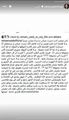 وكتبت ريهام سعيد رسالة مؤثرة حيث قالت: «نادر صعب انت دمرت حياتي ده ولا عشان ميديا ولا قضايا انت لازم تعيش وانت فاهم انكً دمرت حياتي ومستقبلي أنا مسحت الصور القديمة لأني مش قادره اشوفها وأشوف اد ايه انت دمرتني واد ايه أنا كنت جميلة، ولا قادره أشوف صوري الجديده لأني مشوهة ومش أنا.. قريت تقرير الطب الشرعي؟ قريت أن في خطأ طبي؟ قريت اني مشوهة ؟؟؟؟ حسبي الله ونعم الوكيل فيك ربنا ينتقم منك يا رب وأي حد بينصرك عليه أنا ولا حسه اني ست ولا حاسه اني عايزه اعمل حاجه انا انتهيت وانت السبب. قالوا لي ماتمسحينش كل الصور وكل حاجه عشان هتخسري متابعين طب اعمل ايه وشي ضاع هايتابعوا واحده مشوهه ؟؟؟ ليه».
