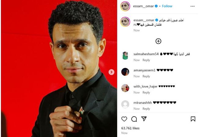 وظهر عصام عمر، في الصور التي نشرها عبر صفحته انستجرام، وهو يرفع علم فلسطين، الذي وضعه رمزا على دبوس بذلته التي ارتدتها خلال الفعاليات وعلق على الصورة " أحلى صورة فى حياتي علشان فلسطين فيها فلسطين".