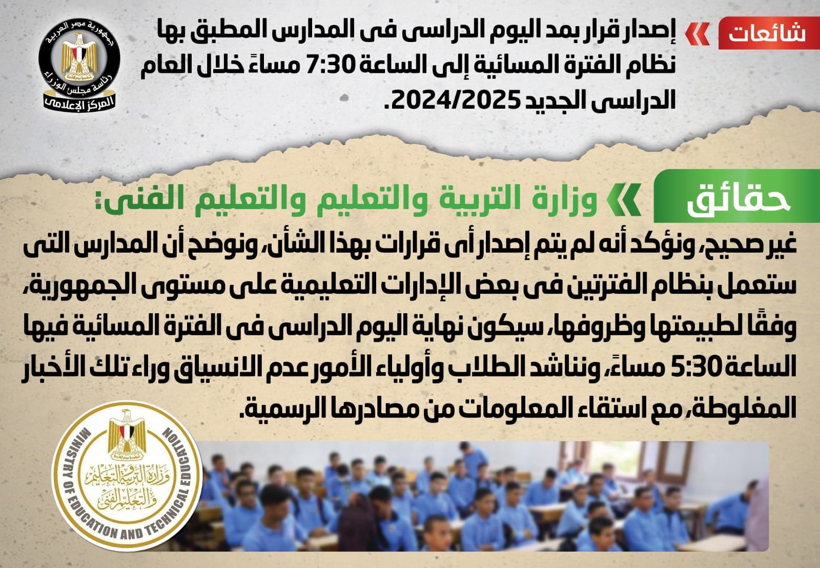 تداولت بعض صفحات التواصل الاجتماعي أنباء بشأن إصدار قرار بمد اليوم الدراسي في المدارس المطبق بها نظام الفترة المسائية إلى الساعة 7:30 مساءً خلال العام الدراسي الجديد 2024/2025، وقد قام المركز الإعلامي لمجلس الوزراء بالتواصل مع وزارة التربية والتعليم والتعليم الفني، والتي نفت تلك الأنباء، مُؤكدةً أنه لا صحة لمد اليوم الدراسي في المدارس المطبق بها نظام الفترة المسائية إلى الساعة 7:30 مساءً خلال العام الدراسي الجديد 2024/2025، وأنه لم يتم إصدار أي قرارات بهذا الشأن، موضحة أن المدارس التي ستعمل بنظام الفترتين في بعض الإدارات التعليمية على مستوى الجمهورية، وفقًا لطبيعتها وظروفها، سيكون نهاية اليوم الدراسي في الفترة المسائية فيها الساعة 5:30 مساءً، مُناشدةً الطلاب وأولياء الأمور عدم الانسياق وراء تلك الأخبار المغلوطة، مع استقاء المعلومات من مصادرها الرسمية.