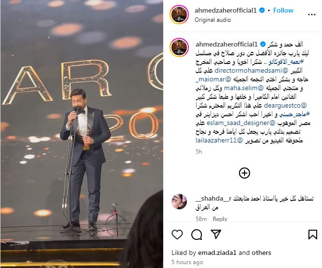 تكريم أحمد زاهر في حفل دير جيست كالأفضل في مسلسل نعمة الأفوكاتو
