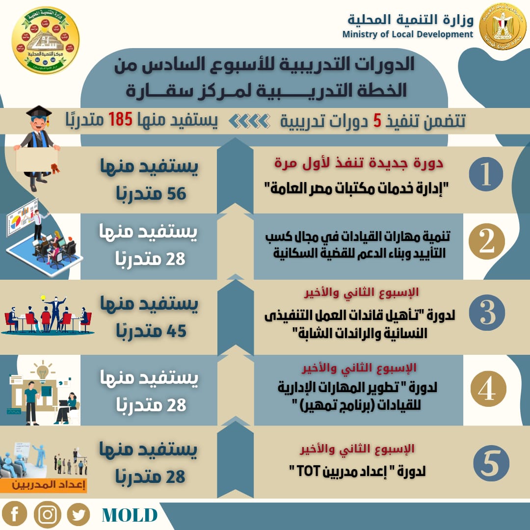 وأوضحت الدكتورة منال عوض، أن الأسبوع السادس لمركز التنمية المحلية للتدريب بسقارة سينطلق بتنفيذ دورة جديدة وهي دورة "إدارة خدمات مكتبات مصر العامة" والتي تستهدف تدريب 56 من المديرين والعاملين بمكتبات مصر العامة الرئيسية والفرعية، ويتم تنفيذها علي مدار اسبوعيين متتاليين بالتعاون مع مكتبة مصر العامة ووحدة تكافؤ الفرص بالوزارة.