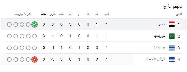 يتقاسم منتخب مصرمع منتخب موريتانيا على صدارة جدول ترتيب تصفيات أمم إفريقيا، ولكن تتصدر مصر بفارق الأهداف عن المنتخب الموريتاني.