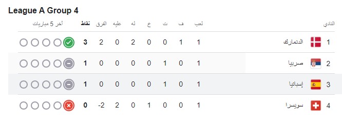 تضم المجموعة الأولى كلًا من إسبانيا والدنمارك وصربيا وسويسرا.