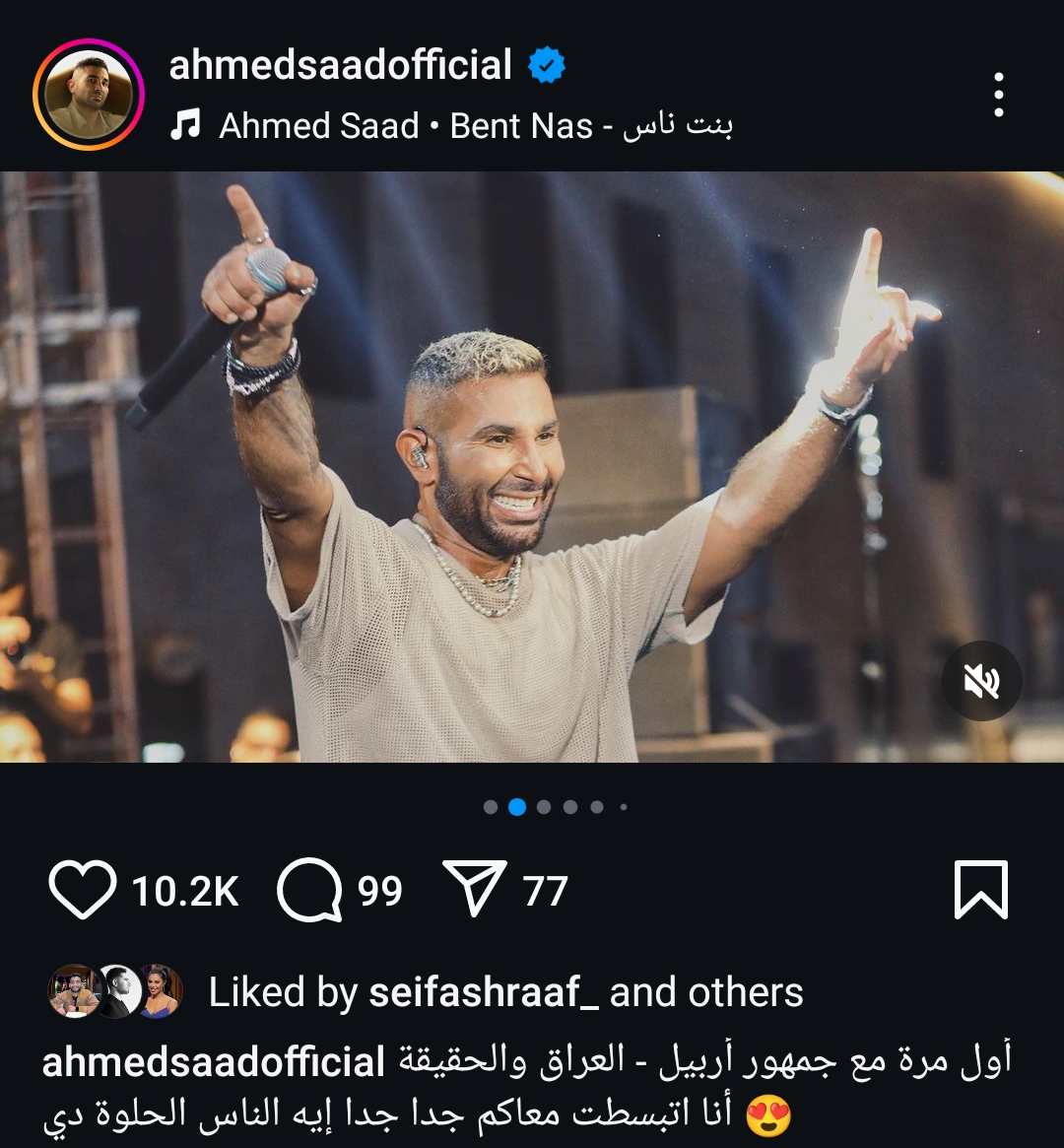 ونشر أحمد سعد صور من الحفل على صفحته الرسمية عبر موقع تبادل الصور والفيديوهات "إنستجرام" وعلق قائلا : "أول مرة مع جمهور أربيل العراق، والحقيقة أنا اتبسطت معاكم جدا جدا إيه الناس الحلوة دي" .