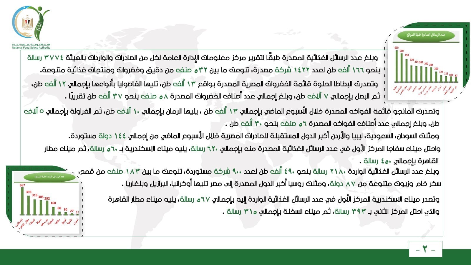 واحتل ميناء سفاجا المركز الأول في عدد الرسائل الغذائية المصدرة منه بإجمالي 620 رسالة، يليه ميناء الاسكندرية بـ 560 رسالة، ثم ميناء مطار القاهرة بإجمالي 450 رسالة.
