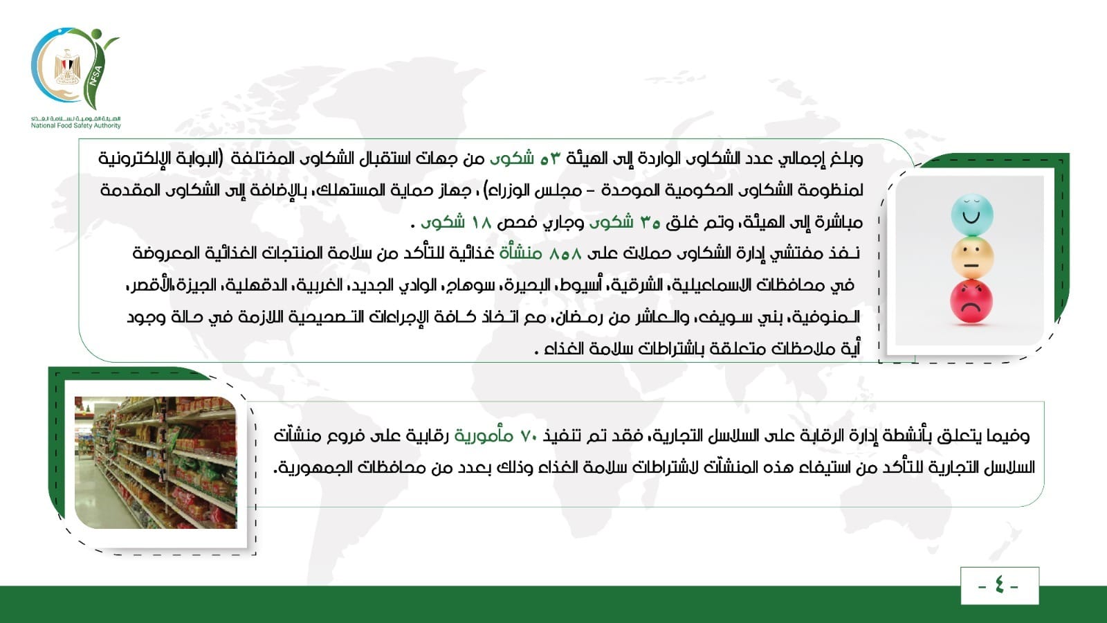 نفذ مفتشي إدارة الشكاوى حملات على 858 منشأة غذائية للتأكد من سلامة المنتجات الغذائية المعروضة في محافظات الاسماعيلية، الشرقية، أسيوط، البحيرة، سوهاج، الوادي الجديد، الغربية، الدقهلية، الجيزة، الأقصر، المنوفية، بني سويف، والعاشر من رمضان، مع اتخاذ كافة الإجراءات التصحيحية اللازمة في حالة وجود أية ملاحظات متعلقة باشتراطات سلامة الغذاء.
