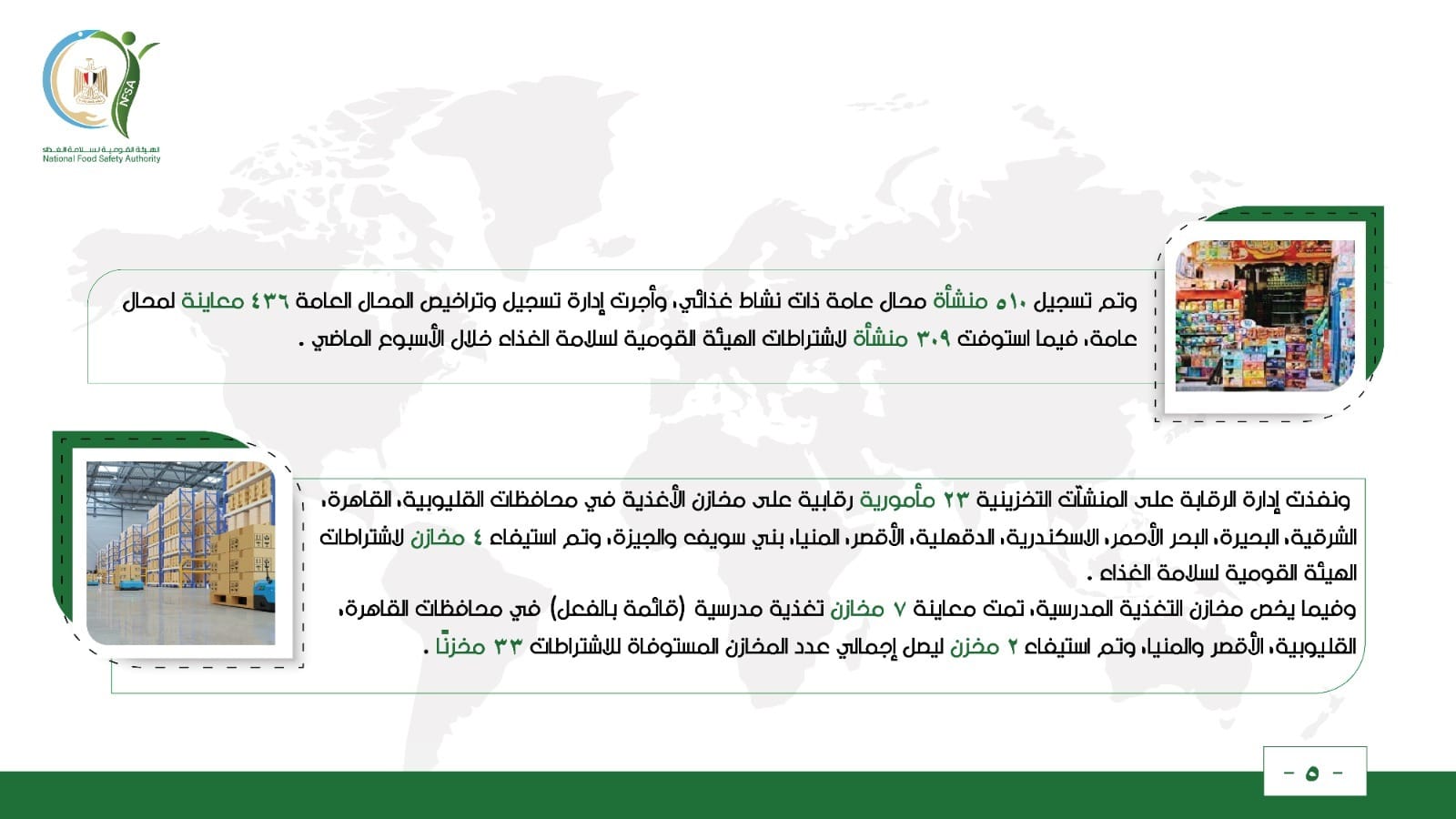 وفيما يخص مخازن التغذية المدرسية، تمت معاينة 7 مخازن تغذية مدرسية (قائمة بالفعل) في محافظات القاهرة، القليوبية، الأقصر والمنيا، وتم استيفاء 2 مخزن ليصل إجمالي عدد المخازن المستوفاة للاشتراطات 33 مخزنًا.