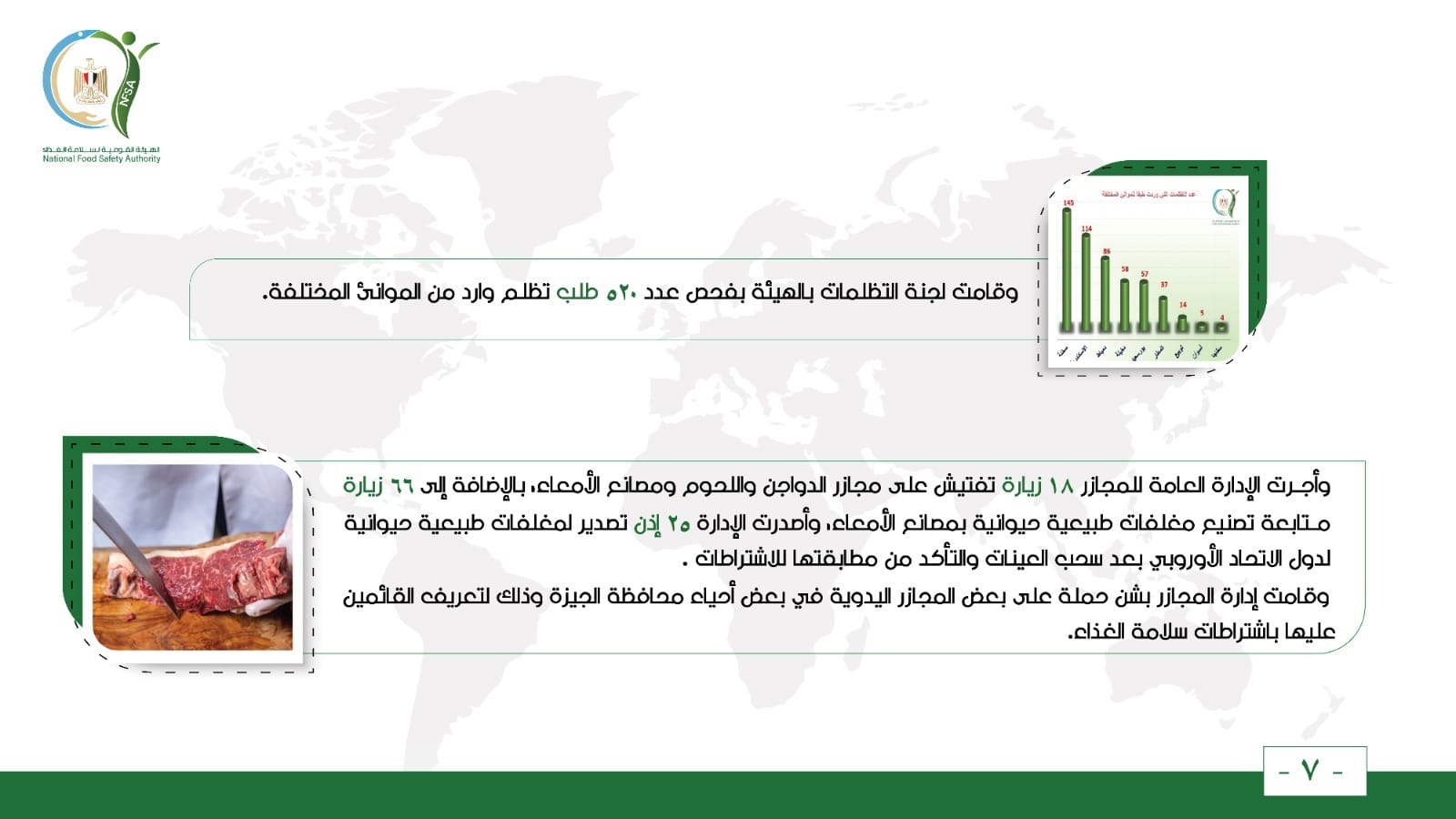 وأجرت الإدارة العامة للمجازر 18 زيارة تفتيش على مجازر الدواجن واللحوم ومصانع الأمعاء، بالإضافة إلى 66 زيارة متابعة تصنيع مغلفات طبيعية حيوانية بمصانع الأمعاء، وأصدرت الإدارة 25 إذن تصدير لمغلفات طبيعية حيوانية لدول الاتحاد الأوروبي بعد سحب العينات والتأكد من مطابقتها للاشتراطات.