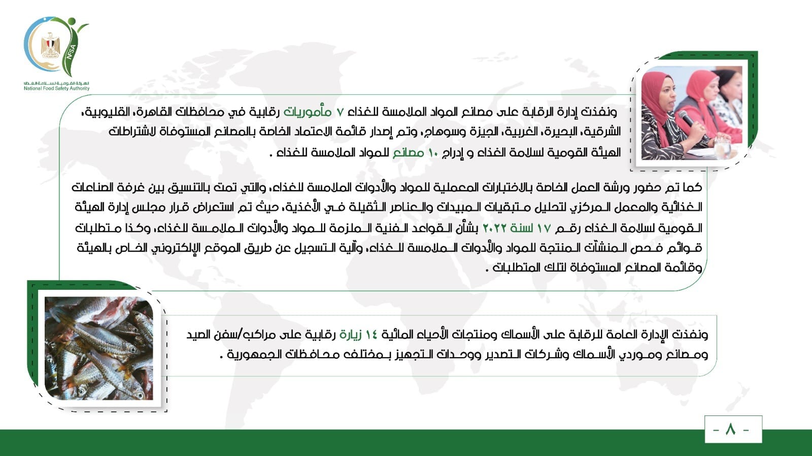 ونفذت الإدارة العامة للرقابة على الأسماك ومنتجات الأحياء المائية 14 زيارة رقابية على مراكب/سفن الصيد ومصانع وموردي الأسماك وشركات التصدير ووحدات التجهيز بمختلف محافظات الجمهورية.