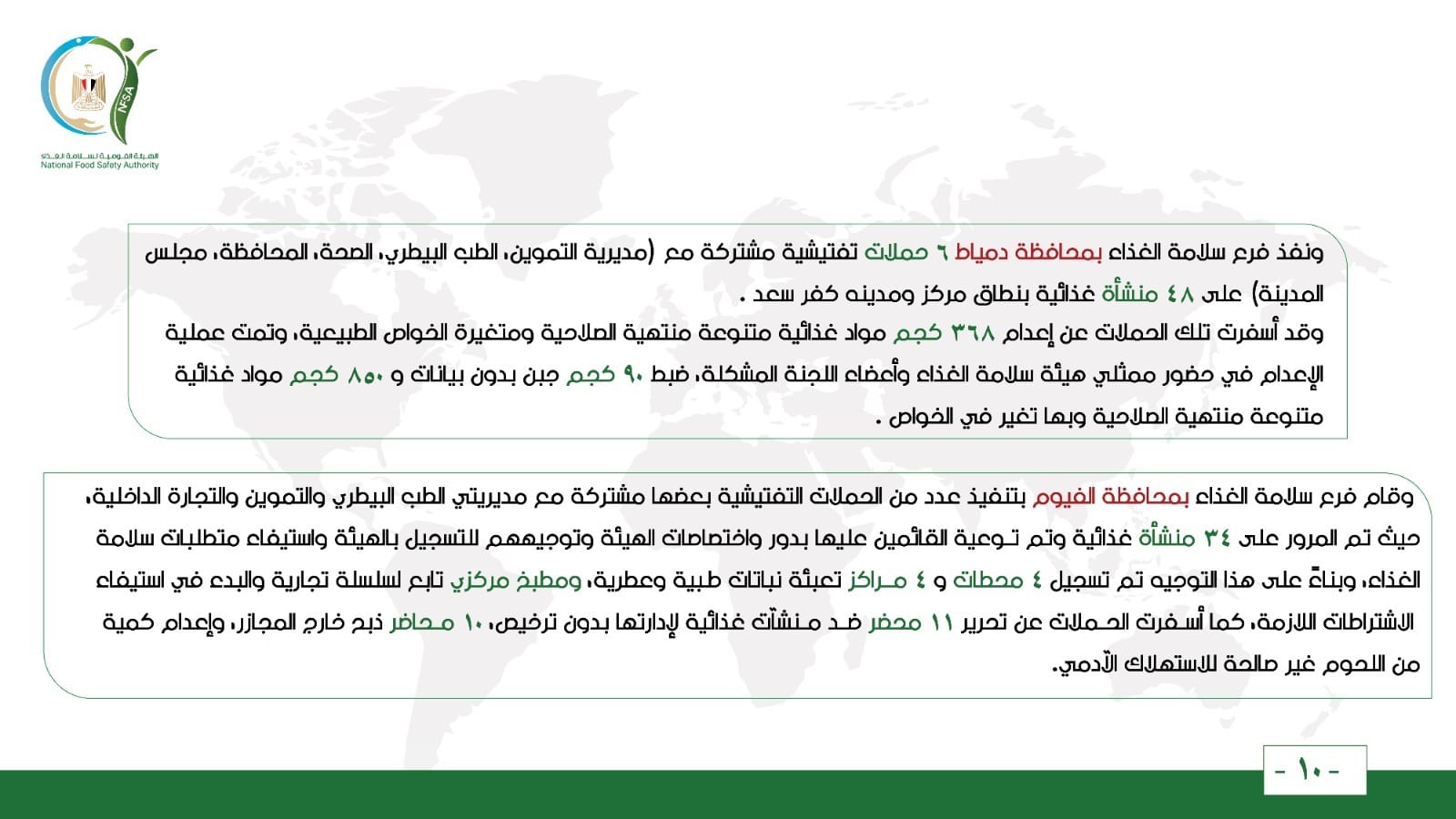 ونفذ فرع سلامة الغذاء بمحافظة دمياط 6 حملات تفتيشية مشتركة مع (مديرية التموين، الطب البيطري، الصحة، المحافظة، مجلس المدينة) على 48 منشأة غذائية بنطاق مركز ومدينه كفر سعد.