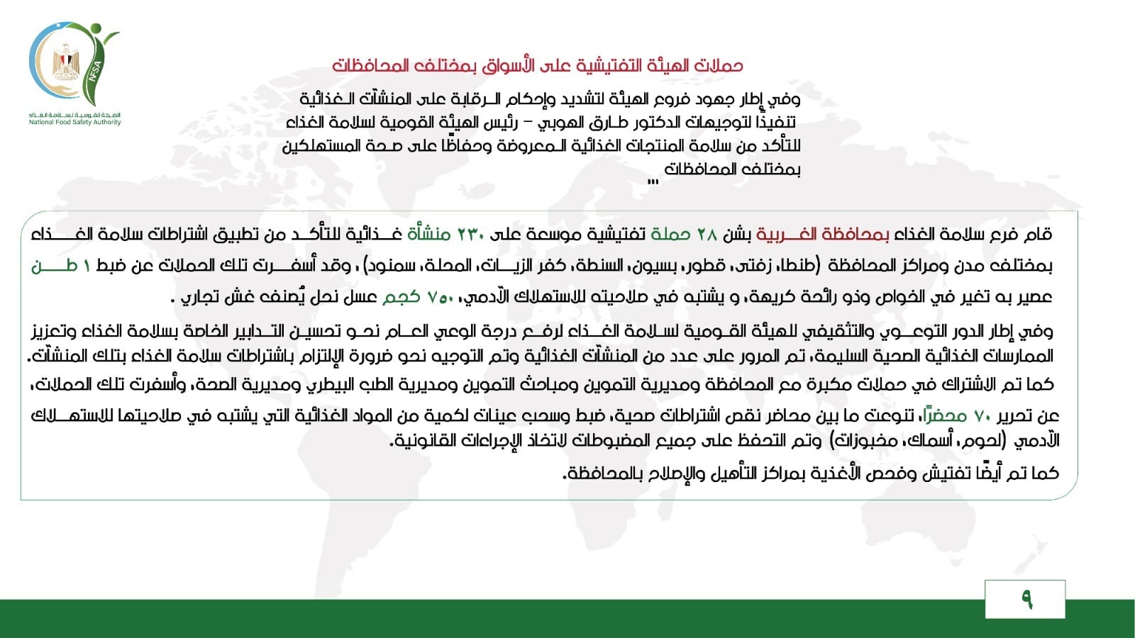 قام فرع سلامة الغذاء بمحافظة الغربية بشن 28 حملة تفتيشية موسعة على 230 منشأة غذائية للتأكد من تطبيق اشتراطات سلامة الغذاء بمختلف مدن ومراكز المحافظة (طنطا، زفتى، قطور، بسيون، السنطة، كفر الزيات، المحلة، سمنود)، وقد أسفرت تلك الحملات عن ضبط 1 طن عصير به تغير في الخواص وذو رائحة كريهة، ويشتبه في صلاحيته للاستهلاك الآدمي، 750 كجم عسل نحل يُصنف غش تجاري.