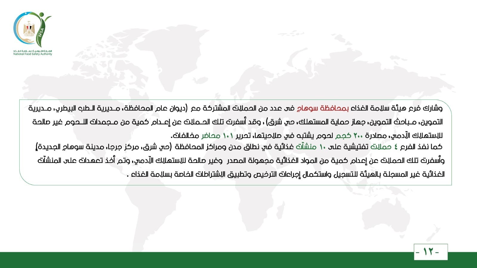 وشارك فرع هيئة سلامة الغذاء بمحافظة سوهاج في عدد من الحملات المشتركة مع (ديوان عام المحافظة، مديرية الطب البيطري، مديرية التموين، مباحث التموين، جهاز حماية المستهلك، حي شرق)، وقد أسفرت تلك الحملات عن إعدام كمية من مجمدات اللحوم غير صالحة للاستهلاك الآدمي، مصادرة 200 كجم لحوم يشتبه في صلاحيتها، تحرير 101 محاضر مخالفات.