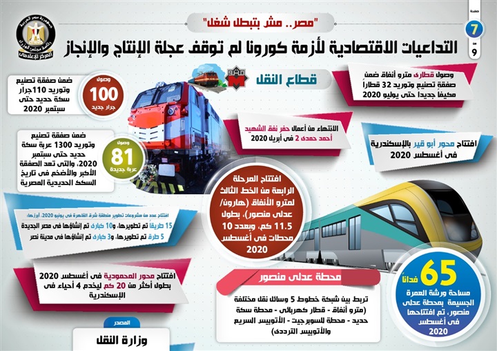 وعلى صعيد قطاع النقل، أوضح التقرير، أنه تم وصول 81 عربة جديدة ضمن صفقة تصنيع وتوريد 1300 عربة سكة حديد، حتى سبتمبر 2020 والتي تعد الصفقة الأكبر والأضخم في تاريخ السكك الحديدية المصرية، وكذلك وصول 100 جرار جديد ضمن صفقة تصنيع وتوريد 110 جرار سكة حديد حتى سبتمبر 2020، هذا بجانب وصول قطاري مترو أنفاق ضمن صفقة تصنيع وتوريد 32 قطاراً مكيفاً جديداً حتى يوليو 2020.