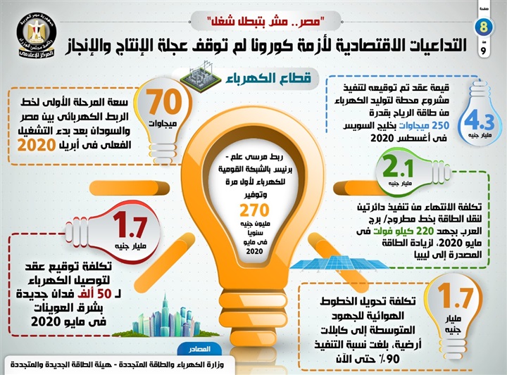 وبشأن قطاع الكهرباء، جاء في التقرير، أنه تم توقيع عقد لتنفيذ مشروع محطة لتوليد الكهرباء من طاقة الرياح بقدرة 250 ميجا وات بخليج السويس بقيمة 4.3 مليار جنيه في أغسطس 2020، وكذلك توقيع عقد لتوصيل الكهرباء لـ 50 ألف فدان جديد بشرق العوينات بقيمة 1.7 مليار جنيه في مايو 2020، كما بلغت تكلفة الانتهاء من تنفيذ دائرتين لنقل الطاقة بخط مطروح/ برج العرب بجهد 220 كيلو فولت، نحو 2.1 مليار جنيه، في مايو 2020، لزيادة الطاقة المصدرة إلى ليبيا.
