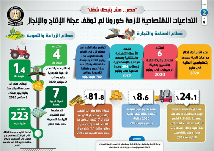 مصر تتحدى كورونا بالانجازات.. الصادرات الزراعية تجاوزت 4 ملايين طن.. تراجع العجز الكلي إلى 7.8% .. ارتفاع حركة الملاحة بقناة السويس بنسبة 4.7%.. إنتاج أكثر من 64.5 ألف برميل من الزيت( انفوجراف)