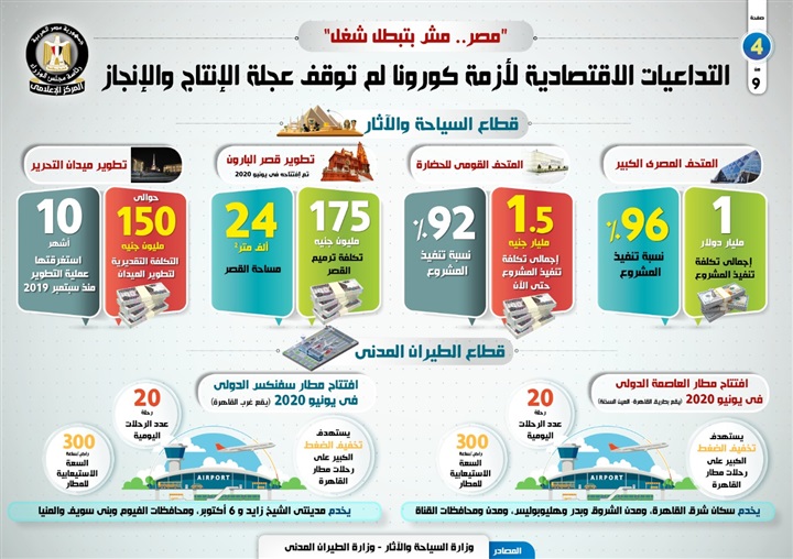 وبخصوص قطاع السياحة والآثار، أبرز التقرير، أنه يتم تنفيذ مشروع المتحف المصري الكبير بتكلفة مليار دولار وبلغت نسبة تنفيذه 96%، بجانب تنفيذ المتحف القومي للحضارة والذي بلغت تكلفة تنفيذه حتى الآن 1.5 مليار جنيه، وبنسبة تنفيذ 92%، وكذلك تم تطوير قصر البارون بتكلفة ترميم 175 مليون جنيه، حيث تبلغ مساحته 24 ألف متر مربع، وتم افتتاحه في يونيو 2020، وأخيراً تطوير ميدان التحرير بتكلفة تقديرية تبلغ حوالي 150 مليون جنيه، وقد استغرقت عملية تطويره 10 أشهر منذ سبتمبر 2019.