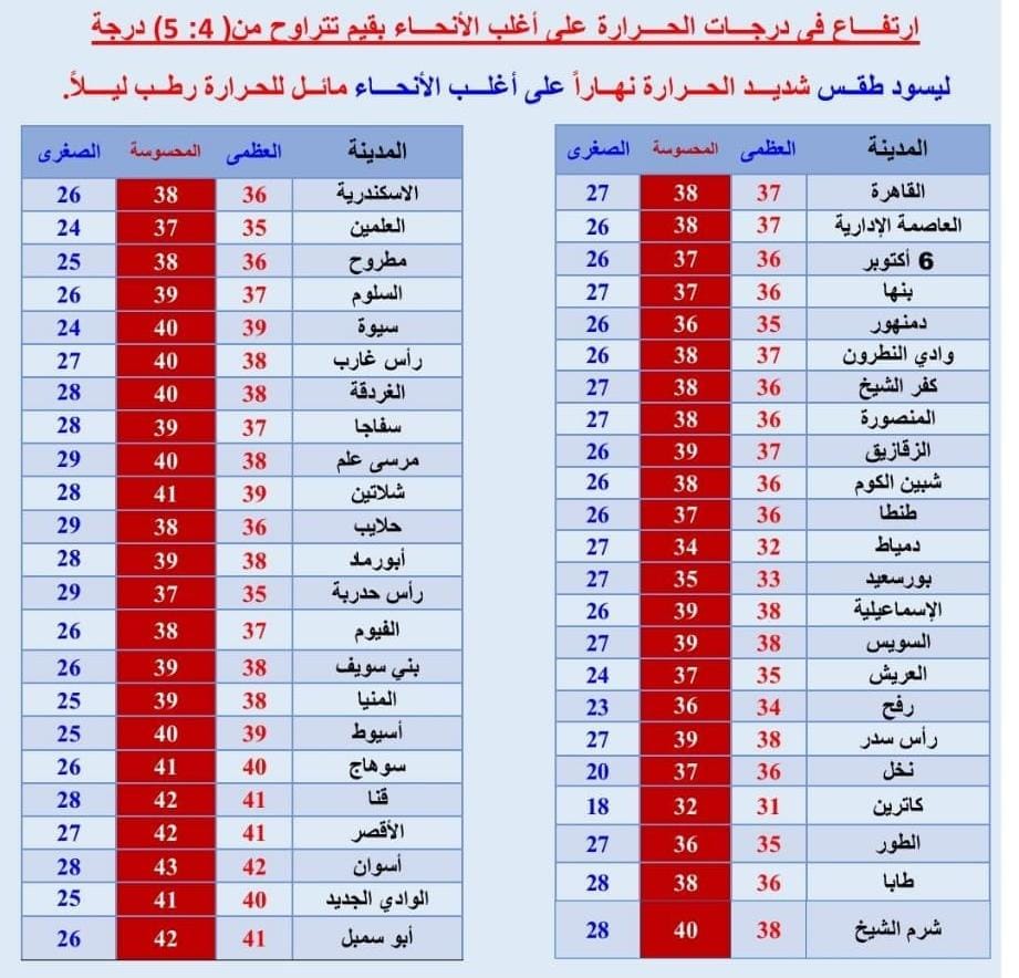 متوسط نسبة الرطوبة المتوقعة في جنوب الصعيد العظمى 20-15 درجة والصغرى 25-20.