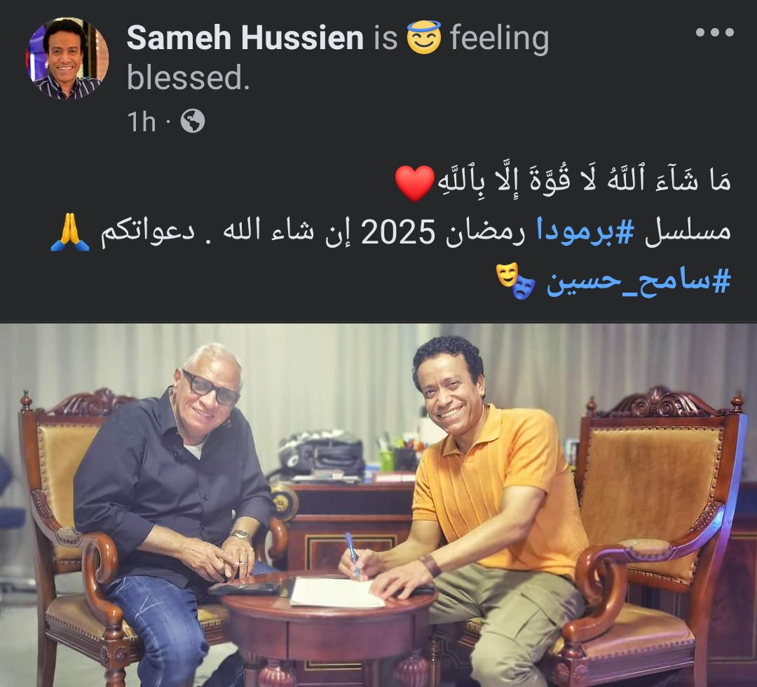 نشر سامح حسين صورة تجمعه مع المنتج أحمد السبكي على صفحته الرسمية عبر موقع التواصل الاجتماعي "فيسبوك" وعلق قائلا: "ما شاء الله لا قوة إلا بالله، مسلسل برمودا رمضان 2025 إن شاء الله، دعواتكم".