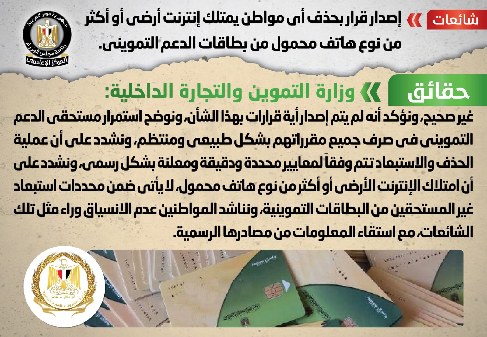 انتشر في بعض صفحات التواصل الاجتماعي أنباء بشأن إصدار قرار بحذف أي مواطن يمتلك إنترنت أرضي أو أكثر من نوع هاتف محمول من بطاقات الدعم التمويني، وقد قام المركز الإعلامي لمجلس الوزراء بالتواصل مع وزارة التموين والتجارة الداخلية، والتي نفت تلك الأنباء، مُؤكدةً أنه لا صحة لحذف أي مواطن يمتلك إنترنت أرضي أو أكثر من نوع هاتف محمول من بطاقات الدعم التمويني، وأنه لم يتم إصدار أية قرارات بهذا الشأن.