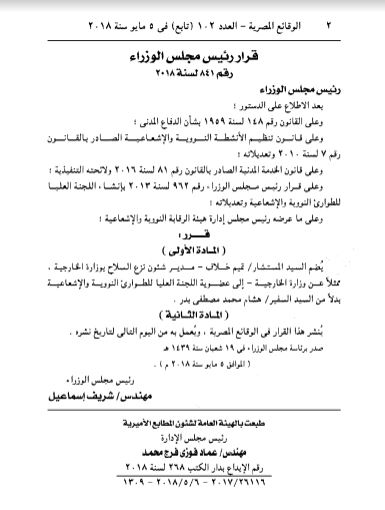 صدر له قرار من المهندس شريف إسماعيل، رئيس الوزراء، بضمه كمدير شئون نزع السلاح بوزارة الخارجية إلى عضوية اللجنة العليا للطوارئ النووية والإشعاعية عام 2018.