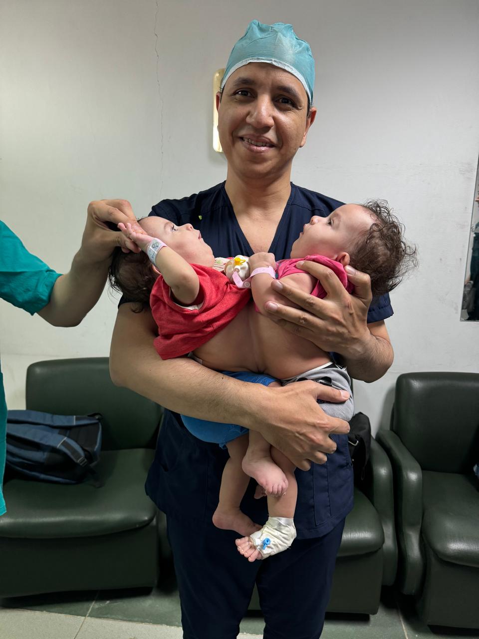 كان مستشفى الأطفال قد استقبل توأم ملتصق، ليتم تقييم الحالة عقب الولادة مباشرة وتشخيصها بواسطة الفريق الجراحي، الذي تشكل من الأستاذ الدكتور طارق صبره والأستاذ الدكتور محمد جميل، وتم اتخاذ قرار تأجيل التدخل الجراحي حتى يتم الطفلتين ٦ أشهر مع استمرار المتابعة سن ٦ الدورية لهم.