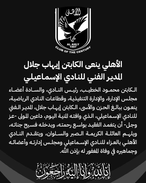 نعى النادي الأهلي وأعضاء مجلس الإدارة، والإدارة التنفيذية، وقطاعات النادي الرياضية، ينعون ببالغ الحزن والأسى، الكابتن إيهاب جلال، المدير الفني للنادي الإسماعيلي، الذي وافته المنية اليوم، داعين المولى -عز وجل- أن يتغمد الفقيد بواسع رحمته، ويدخله فسيح جناته، ويلهم العائلة الكريمة الصبر والسلوان، ويتقدم النادي الأهلي بالعزاء للنادي الإسماعيلي ومجلس إدارته وأعضائه وجماهيره في وفاة المغفور له بإذن الله، إنا لله وإنا إليه راجعون".