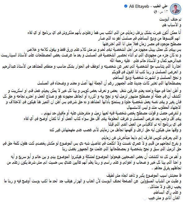 ونشر "الطيب" عبر صفحته الرسمية بموقع «فيسبوك»، قائلا :«تم حذف البوست والأسباب هي، أنا ممكن أكون عبرت بشكل يزعل زمايلي من اللي اتكتب بس هما زعلوني بأنهم مذكروش في أي برنامج أو أي لقاء، أنهم اقتبسوا من وديع البساطي في مسلسل أهو ده اللي صار، مصطلح موجود في مصر زمان فعلا مش انا اللي اخترعتها»
