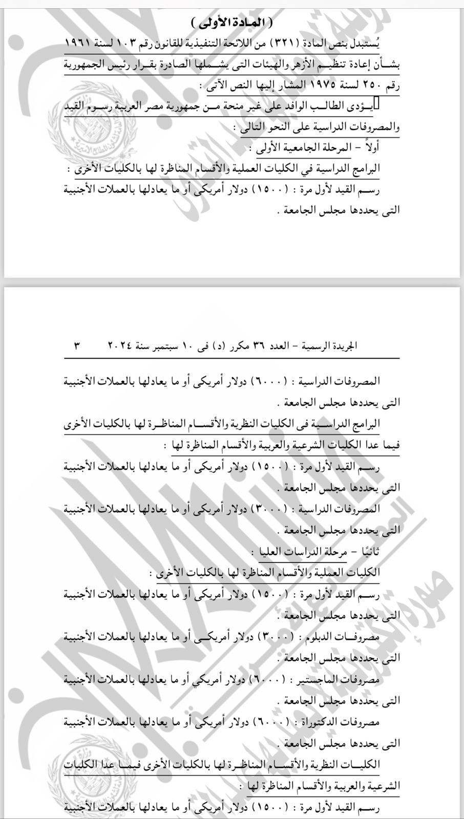 وتضمن أن يؤدى الطالب الوافد على غير منحة من جمهورية مصر العربية رسوم القيد والمصروفات ومنها 1500 دولار أو ما يعادلها بالعملة الأجنبية التى يحددها مجلس الجامعة، بالإضافة إلى تحديد المصروفات الدراسية ورسوم القيد بالكليات العملية.