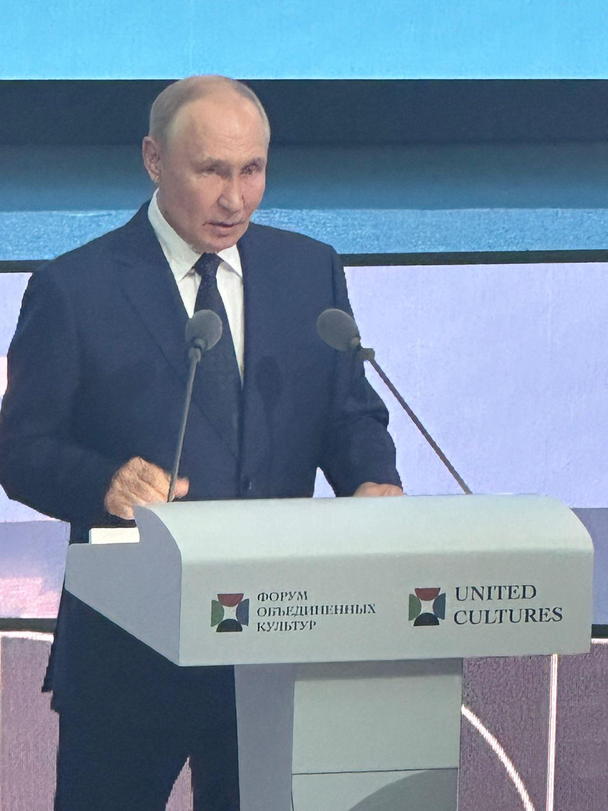 شهد الدكتور أحمد فؤاد هنو، وزير الثقافة المصرية، الجلسة العامة لمنتدى سانت بطرسبرج للثقافات المتحدة، الذي يُعقد تحت عنوان "ثقافة القرن الحادي والعشرين: السيادة أم العولمة؟"، والتي ألقى خلالها الرئيس الروسي، فلاديمير بوتين، كلمة للحضور، وأدارها المبعوث الخاص للرئيس الروسي للتعاون الثقافي الدُولي، ميخائيل شفيدكوي، وذلك ضمن زيارته الرسمية إلى روسيا.
