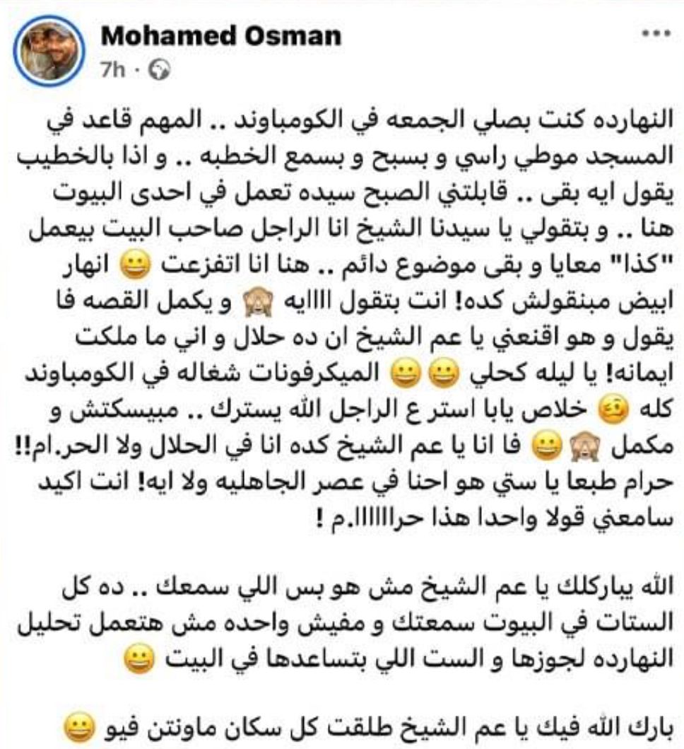 وكتب صاحب الحساب المدعو محمد عثمان عبر صفحته على فيسبوك عن تفاصيل الخطبة بشكل طريف، منشورًا قال فيه: "النهاردة كنت بصلي الجمعة في كومباوند ماونتن فيو، المهم قاعد في المسجد موطي رأسي وبسبح وبسمع الخطبة، وإذ بالخطيب يقول إيه بقى، قابلتني الصبح سيدة تعمل في أحد البيوت هنا، وبتقولي يا سيدنا الشيخ أنا الراجل صاحب البيت بيعمل علاقة معايا وبقى موضوع دائم.