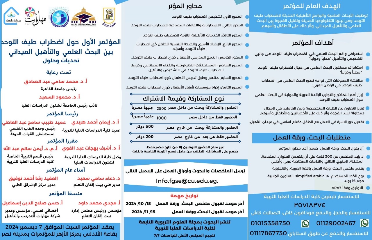 أعلنت كلية الدراسات العليا للتربية بجامعة القاهرة عن موعد إنعقاد المؤتمر الأول لقسم التربية الخاصة، حول "اضطراب طيف التوحد بين البحث العلمي والتأهيل الميداني التربوي: تحديات وحلول"، والذي تحدد له يوم 7 ديسمبر المقبل .